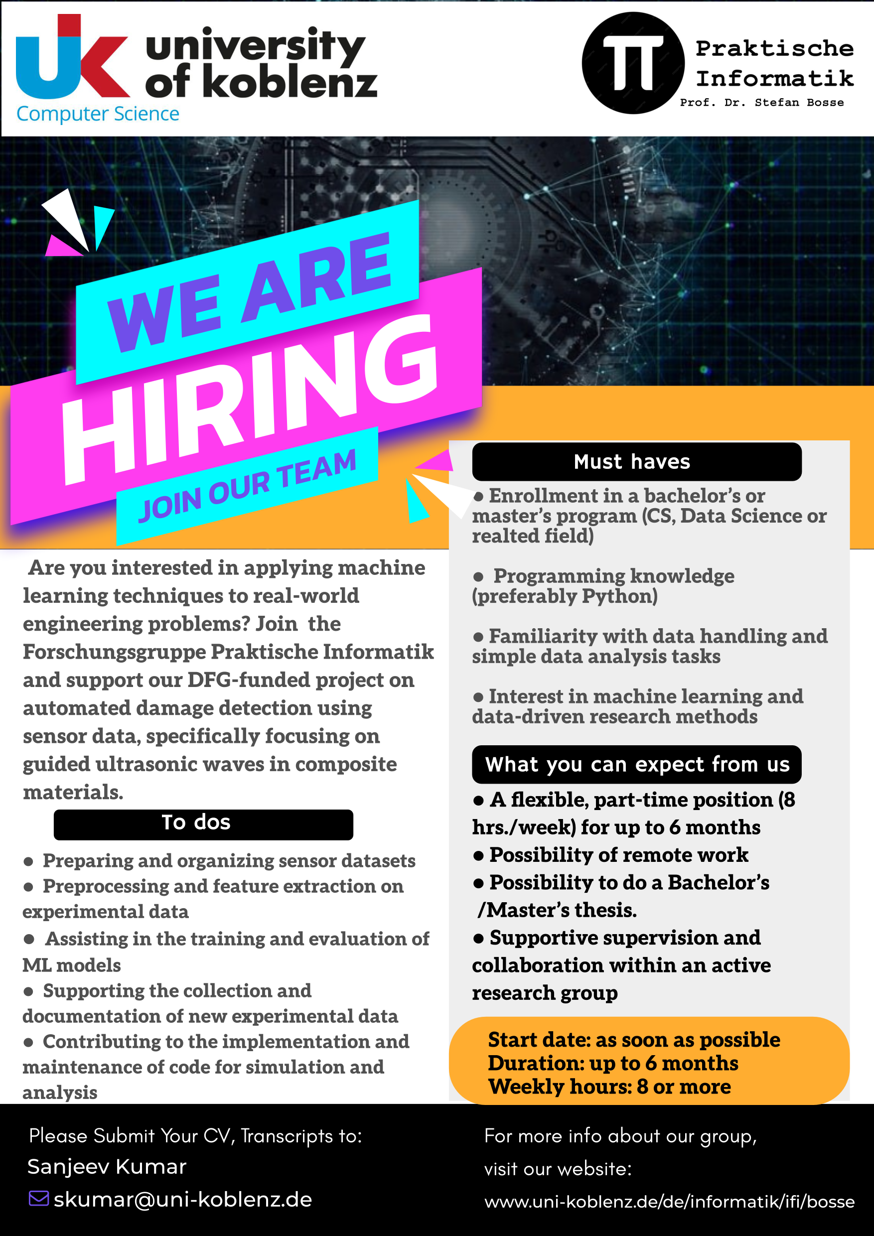 Die Stelle ist eingebunden in die Professur und Arbeitsgruppe Praktische Informatik (Prof. Dr. Stefan Bosse) im Institut für Informatik des Fachbereichs Informatik der Universität Koblenz.